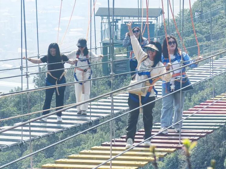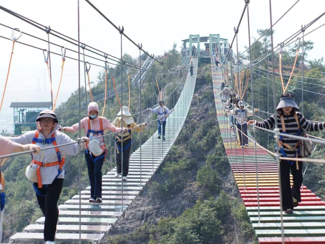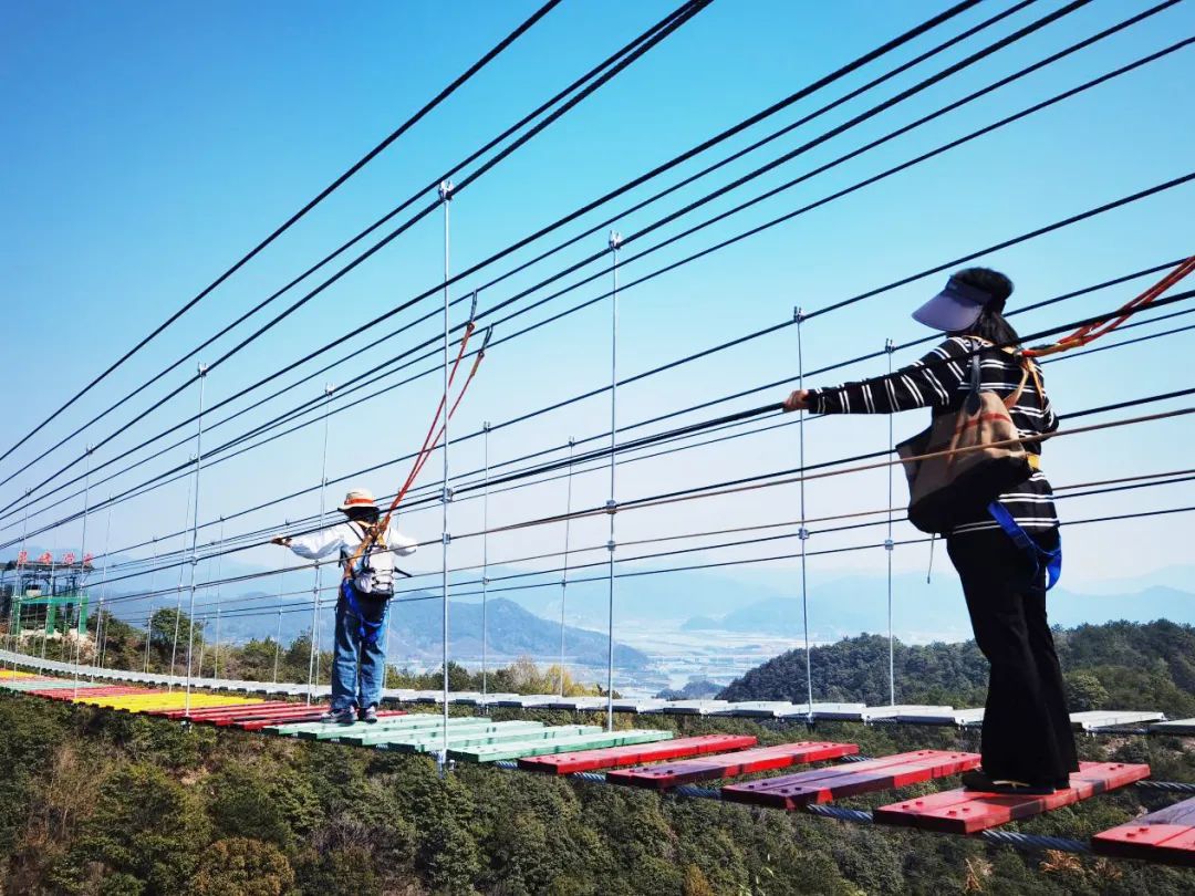 韶光爛漫,漫步尋春。午后,大家轉戰靈巖火山峰景區,沿登山步道結伴而行,鍛煉身體之余,俯瞰浙東沿海罕見(jiàn)的火山口地貌遺跡。人花相映,山海相逢,既有虛空行走、高空滑翔的“挑戰派”,也有慢行賞景的“休閑黨”,共同享受山海交織的壯闊畫(huà)卷。