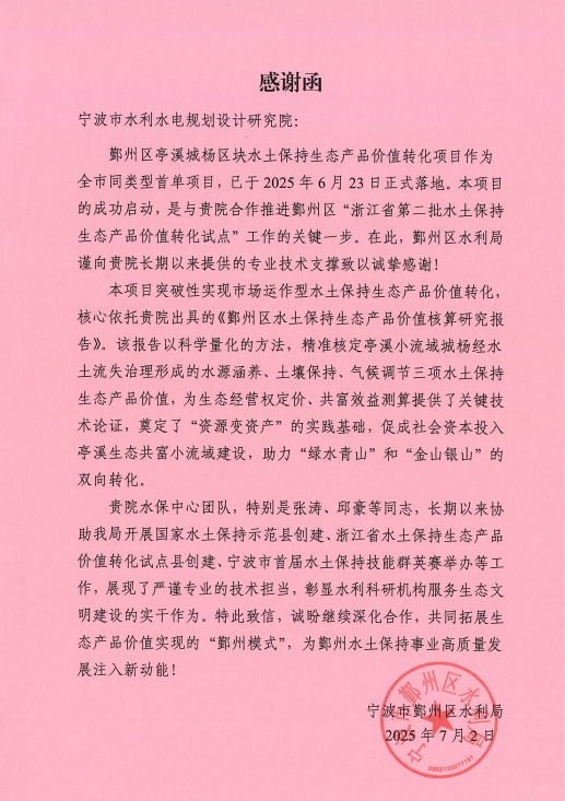 鄞州區水利局在感謝信中特別指出,我院提供的技術(shù)支持不僅專(zhuān)業(yè)高效,更體現了強烈的責任意識和服務(wù)意識。信中高度贊揚了水保中心團隊,特別是張濤、邱豪等同志,在相關(guān)工作中展現的嚴謹務(wù)實(shí)的工作作風(fēng)、精益求精的專(zhuān)業(yè)態(tài)度,以及不辭辛勞的奉獻精神。這份肯定不僅是對項目組的褒獎,更是對我院全體職工莫大的鼓舞和激勵。