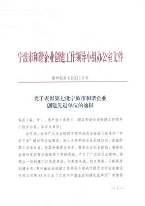 我院榮獲寧波市第七批“和諧企業(yè)創(chuàng )建先進(jìn)單位”榮譽(yù)稱(chēng)號
