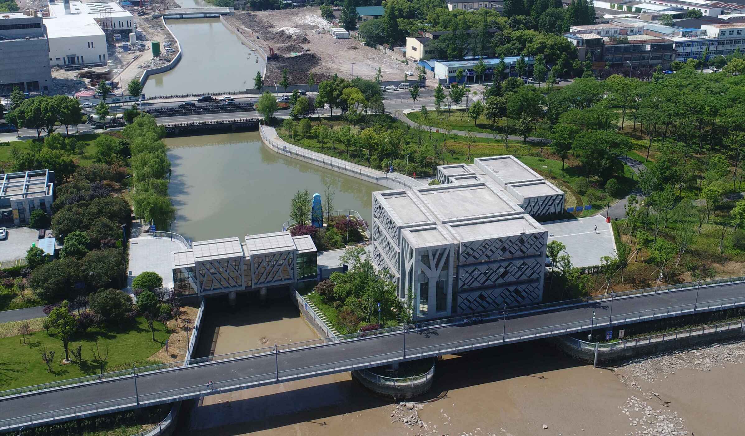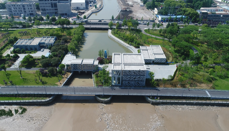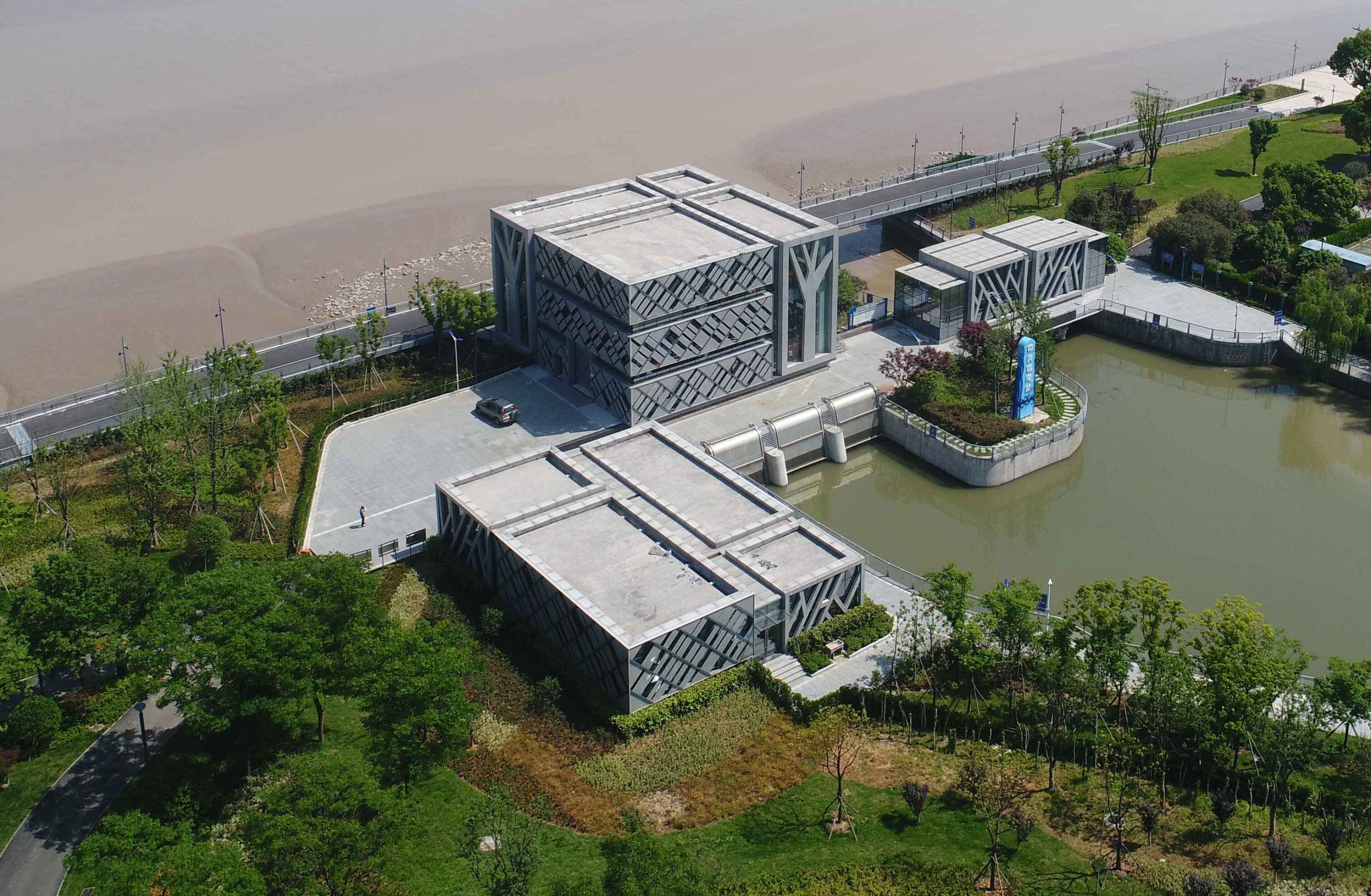 工程通過(guò)抽象手法,將樹(shù)、落葉等元素融入到建筑表情之中,從而閘站更像是沿江公園里面的雕塑,通過(guò)虛實(shí)的結構處理,弱化了高大廠(chǎng)房結構的厚重感。