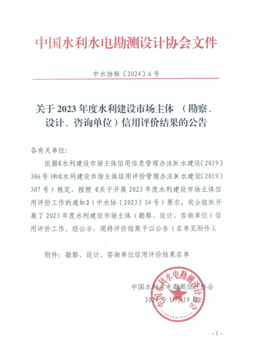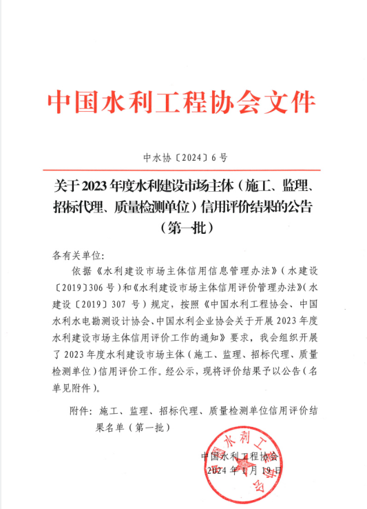 近日,中國水利工程協(xié)會(huì )《關(guān)于2023年度水利建設市場(chǎng)主體(施工、監理、招標代理、質(zhì)量檢測單位)信用評價(jià)結果的公告(第一批)》(中水協(xié)〔2024〕6號)、中國水利水電勘測設計協(xié)會(huì )《關(guān)于2023年度水利建設市場(chǎng)主體(勘察、設計、咨詢(xún)單位)信用評價(jià)結果的公告》(中水協(xié)秘〔2024〕6號)、《關(guān)于2023年度全國水利水電勘測設計行業(yè)信用評價(jià)結果的公告》(中水協(xié)秘〔2024〕7號)發(fā)布。