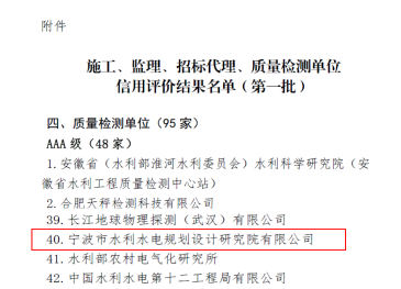 今年,寧波市水利院繼信息化業(yè)務(wù)企業(yè)信用獲評AAA最高等級后,再創(chuàng )佳績(jì),勘察、設計、咨詢(xún)、質(zhì)量檢測4項業(yè)務(wù)獲評AAA級,水資源論證,水文、水資源調查評價(jià),水土保持方案編制3項獲評AAA+級,均為最高等級。其中,水文、水資源調查評價(jià),質(zhì)量檢測兩項為首次參評。